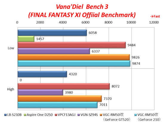 次に、ファイナルファンタジーXIのベンチマークテストである「Vana'Diel Bench 3」である。こちらも比較的軽めのテストだが、品質をLowにすれば「Aspire One D250」でもテストできる。結果を見ると、「LB-S210B」の性能は「Aspire One D250」を大きく上回っており、買い換えによって快適さが上がっているのがよくわかる。ただ、性能差があるはずの「VPCF13AGJ」と「VGC-RM50改(GeForce GT520)」「VGC-RM50改(GeForce 210」の間に差がないことから、テストが軽すぎて頭打ちになっていると思われる。「LB-S210B」の結果はそこまでは行かず、GeForce 8400M GSを搭載する「VGN-SZ94S」相当である。3DMark2001の時と同じく、古い世代のベンチマークテストでは結果がふるわないようだ。