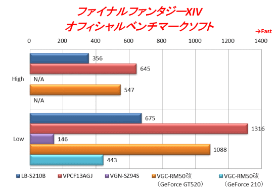 同じファイナルファンタジーのベンチマークテストでも新しい「ファイナルファンタジーXIV オフィシャルベンチマークソフト」の結果を見てみよう。Lowでは「VGC-RM50改(GeForce GT520)」や「VPCF13AGJ」には劣る物の、「VGN-SZ94S」は大きく上回り、「VGC-RM50改(GeForce 210)」も超える性能である。この傾向は3DMark06と同じだ。最新のローエンドグラフィックボードには及ばないが、1世代前のローエンドグラフィックボードは上回る性能である。