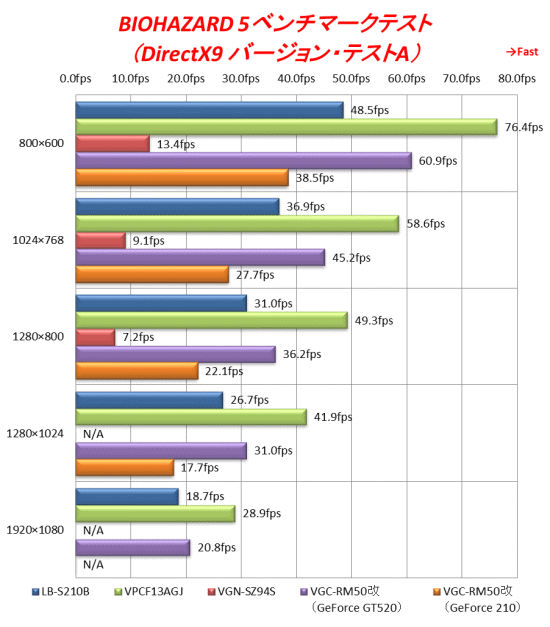 実際のゲームを使用したベンチマークテストである。まずは「BIOHAZARD 5ベンチマークテスト」である。DirectX9バージョンとDirectX10バージョンがあるが、Windows XPの機種ではDirectX9バージョンしか動作しないことから、こちらに統一した。またテストAの結果を掲載している。結果を見ると、これまで同様、「VGN-SZ94S」は大きく上回り、「VGC-RM50改(GeForce 210)」も超える性能である一方、「VGC-RM50改(GeForce GT520)」には及ばないという結果である。ただ、よく見ると高解像度ほど「VGC-RM50改(GeForce GT520)」との差が縮まっていることがわかる。800×600ドットでは、「VGC-RM50改(GeForce GT520)」の79.6%、「VPCF13AGJ」の63.5%の性能だが、これが1024×768ドットではそれぞれ81.6%と63.0%、1280×800ドットでは85.6%と62.9%、1920×1080ドットでは89.9%と64.7%である。GeForce GT520はグラフィックメモリのインタフェースが64bitで、GeForce GT425Mの128bitと比べると狭い事から、帯域幅が狭く、高解像度ほどここがボトルネックになって性能が下がっていると思われるが、「Core i3-2350M」内蔵の「Intel HD Graphics 3000」では、むしろGeForce GT425と同じ傾向を示しているのは驚きである。
