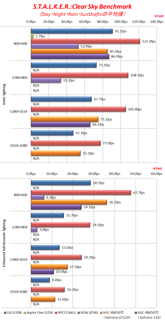 「S.T.A.L.K.E.R.:Clear Sky Benchmark」の結果である。「Day」「Night」「Rain」「SunShafts」の4パターンの結果が出るが、今回は平均値を掲載している。また、画質設定のプリセットではもっとも軽い「Static lighting」ともっとも重い「Enhanced full dynamic lighting」の結果を掲載している。 まず「Static lighting」の結果である。これは800×600ドットではかろうじて「Aspire One D250」でテストが実行できている。この結果を見ると「LB-S210B」は「Aspire One D250」の33.7倍の性能であり、比べものにならない。また、いずれの解像度でも「VGC-RM50(GeForce GT520)」に近い値を出しており、CPU内蔵グラフィックとしては十分な性能と言える。また、このテストの結果は1秒あたりのコマ数である「fps」で表され、一般的には30fps以上あるとスムーズに表示できていると言える。「LB-S210B」では最高の1920×1080ドットでも30fpsを大きく上回っており、画面効果を低い設定にすれば最新ゲームも遊べるレベルになっている事に驚きである。 一方、設定を「Enhanced full dynamic lighting」に変更すると、「VGC-RM50改(GeForce GT520)」や「VPCF13AGJ」との差が広がっている。専用のグラフィックメモリを搭載していないためなのか、機能的なものなのかはわからないが、設定を重くしたときの低下率が大きいのは仕方のないところだろう。とはいえ、「VGC-RM50改(GeForce 210)」は上回る結果であり、CPU内蔵グラフィックでありながら、性能的には悪くな事はわかる。ただ、最低解像度の800×600ドットでも、30fpsを切る結果となっており、この設定ではプレイするのは難しそうだ。