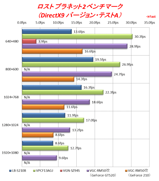 「ロストプラネット2ベンチマークテスト」である。「BIOHAZARD 5ベンチマークテスト」と同じ理由でDirectX9バージョンでのテストとなる。またテストAの結果を比較している。これを見ると、640×480ドット以外では「LB-S210B」は「VGC-RM50改(GeForce 210)」を超える結果であり、高解像度になるほど「VGC-RM50改(GeForce GT520)」にも近い性能を示している。「LB-S210B」では640×480ドット結果が800×600ドットより低くなっているが、何度テストを行っても同じ結果であり、原因は不明である。また、かろうじて640×480ドットのテストのみ正常完了した「VGN-SZ94S」との性能差はかなりのものだ。これを見ると性能は良さそうだが、800×600ドットの低解像度でも19.5fpsとなっており、スムーズだと言えるレベルではない。CPU内蔵グラフィックとしてはこれまでに無いくらい性能は良いが、あくまでローエンドグラフィックボードとの比較であり、最新の重めのゲームを動かすには荷が重いようだ。