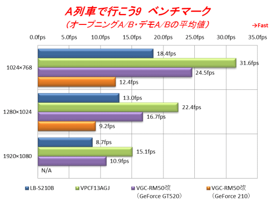最後に「A列車で行こう9 ベンチマークテスト」である。「オープニングA」「オープニングB」「デモA」「デモB」の4つのテストが行われ、fpsで結果が表示されるが、平均値を出して比較している。これを見ると、「VGC-RM50改(GeForce 210)」を大きく上回る結果であり、高解像度では「VGC-RM50改(GeForce GT520)」にも迫る勢いだ。ただ、1024×768ドットでも18.4fpsと高いとは言えず、ましてやこのゲームは1920×1080ドットの広い画面でのプレイが売りだけに、その解像度では8.7fpsとお世辞にもスムーズとは言えない。プレイするには性能不足の感がある。