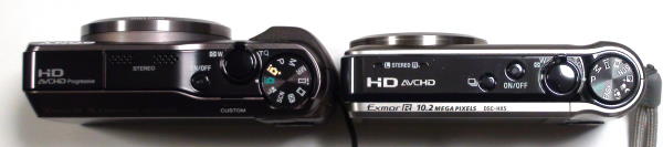 それでは、早速「DSC-HX30V」の外見を見てみよう。まず最初の感想としては、大きな本体と上品な色であるということだ。本体の大きさは、これまで使っていた「DSC-HX5V」と比べると、縦横厚みのすべてが一回りずつ大きくなったような印象だ。ただ、中型機と比べると十分に小さく、また光学20倍ズームを搭載しているとも思えない厚みだ。ある意味、「DSC-HX5V」からの機能アップを考えると、よくこの程度の大型化におさえたものだと思う。本体は何とも言えないシックなブラウンになっており、前面の手で握る部分と、液晶面の親指でホールドする部分だけが革張り風の加工になっているのも高級感がある。上面は金属(風?)となっている。 それでは各パーツを見てみよう。背面は左側が液晶ディスプレイで、右側が操作パネルになっている。液晶はアスペクト比4:3の3.0インチである。液晶の周囲、特に右側に大きく黒い部分があるため、電源が入っていないと液晶ディスプレイはもう少し大きめに見える。これまで使っていた「DSC-HX5V」と比較してみると、基本的には変わっていないが、親指のホールド位置が窪みから革張りに変わっている。個人的にはこの窪みはホールドしやすくわかりやすかったため残念だ。ただ、「DSC-HX30V」も持ってみるとホールド感は良い。配置としては、十字キーの位置と「MENU」「再生」「ゴミ箱」のボタンの位置は変わっていないが、「MOVIE」ボタンの位置が変更されている。どちらが使いやすいかは、実際にビデオ撮影をした感想と併せて後述する。一番変わったのは十字キーだ。「DSC-HX5V」では、ただの4方向ボタン+真ん中の決定ボタンだったが、「DSC-HX30V」ではホイールに変更されている。このホイールは十字キーとしても使えるため、4方向に押しても、左右に回しても使えるという優れものだ。操作性は格段にアップしている。また、ボタンが回転するようになったため、ボタンに彫り込まれていたボタンのマークは、ボタン外に印字される形に変更されている。彫り込まれているのは高級感があったが見にくかったので、実用面ではこちらの方が上だ。背面から見ると、液晶上部までの高さはほぼ一緒だが、そこから上面にかけて「DSC-HX5V」が直角に曲がっているのに、「DSC-HX30V」では斜めに面取りされている分大きくなっている。逆に言うと面取りすることで、大きさを感じさせにくくしているとも言える。