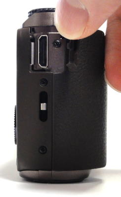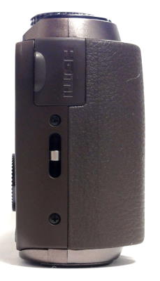 液晶側から見て左側面にはキャップが付いている部分がある。中をあけるとminiHDMI端子が現れる。「DSC-HX5V」では底面の専用コネクタからアダプタを介してHDMI出力が可能だったが、「DSC-HX30V」では内蔵され、ケーブルが直接接続できるようになった。これは非常に便利である。
