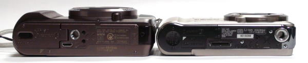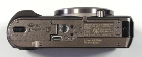 底面を見てみよう。「DSC-HX5V」では端ぎりぎりにあった三脚用ネジ穴が、中央に近くなった。「DSC-HX5V」では小型の三脚などに取り付けると、非常にバランスが悪かったが、これが改善されたのは素直にうれしいところだ。レンズを上にした時の左側には、バッテリとメモリカードスロットのカバーがある。「DSC-HX5V」ではカバー全体を外側にスライドさせるとカバーが開いたが、「DSC-HX30V」ではカバーにつけられたスライドロックを横にスライドさせるとロックが外れてカバーが開く。「DSC-HX5V」の、カバー全体をスライドさせる方法の方が、大きいため作業しやすいが、反面カバンの中などで勝手に開いてしまっている事があった。その点では「DSC-HX30V」の方式の方がよいのかもしれない。「DSC-HX30」は中央にmicroUSB端子がある。「DSC-HX5V」では専用の「マルチ端子」があり、ここに付属のアダプタを挿すとminiUSB端子とHDMI出力端子になった。「DSC-HX30V」ではHDMI端子が内蔵されたので、残るUSB端子もそのまま内蔵するだけで良くなったのである。なお、これまで一貫してminiUSB端子だったが、今回からmicroUSB端子となった。microUSBはスマートフォンで採用されているが、パソコンの周辺機器としてはminiUSBの方が一般的であるため、意外な変更点だったと言えよう。