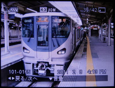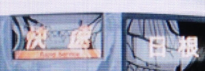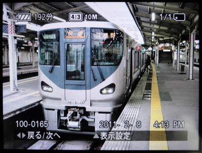 まず、一番上の液晶ディスプレイ全体を見てみよう。「DSC-HX5V」の方が青みがかかって見えるが、実際には暗いというイメージだ。コントラストも「DSC-HX30V」の方高く、黒が引き締まっているのに潰れていない。次に画素数のアップがどの程度の差になるのか、写った写真の一部と、メニューの文字の部分を拡大して比較してみた。2枚目を見ると、「DSC-HX5V」では各ドットの隙間が見えるほどで、快速の「速」の字や、日根野の「根」の字も潰れて、よく分からない。一方、「DSC-HX30V」ではこれらの文字もはっきり見える上に、快速の下の「Rapid Service」の英語文字も読めそうなほどだ。3枚目を見ても解像度の違いは一目瞭然で、DEC-HX30Vの方が文字の輪郭が綺麗で、文字自体がくっきりしている印象だ。ここまで違うとさすがに撮影時にも違いを感じるほどで、画素数がアップしたのは素直に喜びたい点だ。