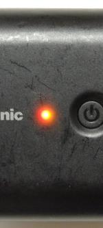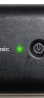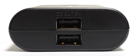 それでは早速「QE-PL201」を使用してみるとしよう。箱から取り出した感想は、思ったより小さく、思ったより重い事だ。5400mAhという容量から想像していたよりも、かなり小さい。63×70×24mmという大きさで、カバンに入れて持ち歩いても邪魔にならなさそうだ。一方で大きさから想像するよりズッシリしている。中身のほとんどがバッテリなので当然と言えば当然だが、この大きさで150gである。バッテリは重い物だと改めて実感した。 さて、本体だが、上から見ると正方形に近く、横から見ると半円と直線で構成された形状をしている。上面には一見すると電源ボタンだけがあるように見える。しかし、その左側に残量表示LEDが埋め込まれ、表面のプラスチックが透けて光るような印象となる。LEDは1つで3色に光るようになっている。右側面は「QE-PL201」に充電する際に使用する入力用USBポートと、ストラップ用の穴らしきものがある。一見穴が2つ開いているように見えてしまい、一瞬わかりにくい事と、この重さでストラップをつけるのかという疑問はある。 USBポートはmicroUSB形状となっており、スマートフォンなどの充電ケーブルがそのまま使えるようになっている。反対の左側面は機器への給電用の出力USBポートが2つ並んでいる。合わせて1.5Aまでなので、例えば1Aとスマートフォンと500mAのデジタルオーディオプレイヤーというような組み合わせは問題ないが、1Aの機器が2つだと充電できないか、遅くなってしまう。2ポートのUSBポートは非常に接近しているので、USBケーブルを2本つなぐのは問題ないだろうが、直接USBポートに挿し込んで充電するような機器の場合、もう1つのポートが使用できなくなる可能性がある。場合によってはUSB延長ケーブルが必要になるだろう。