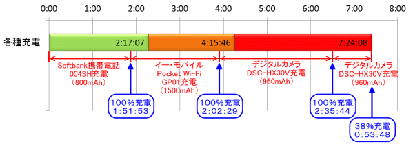 まず、Softbankの携帯電話「004SH」の充電を行ったが、1時間51分53秒で充電が完了した。この間残量表示LEDは緑のままだった。続いてイーモバイルのモバイルルータ「Pocket Wi-Fi GP01」の充電を行うと、充電開始後25分14秒後に残量表示LEDがオレンジに変わった。そのまま充電を続け、2時間2分29秒で充電が完了した。続いてソニーのデジタルカメラ「DSC-HX30V」の充電を行うと21分24秒後に残量表示LEDが赤に変わった。残量が少なく最後まで充電できないかと思ったが、2時間35分44秒で充電が完了した。そこで、デジタルカメラ「DSC-HX30V」のバッテリを空のバッテリに交換し充電すると、53分48秒の時点で「QE-PL201」の残量が無くなり充電が止まった。この時点で「DSC-HX30V」の残り撮影可能時間の表示から、約38%まで充電できたようである。 これを見ると、なんと携帯電話1台、モバイルルータ1台、デジタルカメラが1台と38%の充電ができたことになる。これだけ多くの製品に充電できるとなると、旅行などの際にも心強い。ちなみに、オレンジ色の時間が短いが、これはちょうどその間に充電していた機器が「Pocket Wi-Fi GP01」だったためと思われる。「Pocket Wi-Fi GP01」はバッテリ容量が1500mAhと、他の2つの機器よりバッテリ容量が大きいにもかかわらず、充電時間が変わらないことから、入力電流が大きいようだ。そのためバッテリの消費が早かったのだろう。 ちなみに、すべての充電できたバッテリ容量を計算すると、3625mAhとなる。本来はバッテリは完全にはゼロにはなっていなかっただろうから、もう少し少ないと思われるが、雑に計算すればこういう事になる。「QE-PL201」のバッテリ容量が5400mAhで、充電に使用するとどうしてもロスが出ることから、この結果はなかなかといえるだろう。