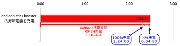 ちなみに、これまで使っていたSANYOの「eneloop stick booster」でもテストを行ってみた。「eneloop stick booster」の場合1900mAhの単三型充電池を2本入れて使用する。出力が500mAという事もあってか、携帯電話「004SH」以外では正常に充電できなかったため、携帯電話「004SH」のみでテストを行った。携帯電話「004SH」の充電は2時間24分06秒で完了した。「QE-PL201」を使う場合より時間がかかっているが、とりあえずフル充電が可能であった。続いて、もう一度携帯電話「004SH」を充電したところ、わずか4分36秒後に充電が停止した。4%充電できただけだった。「eneloop stick booster」では容量800mAhの携帯電話1台を充電するのがやっとという所だ。「QE-PL201」のすごさが分かる結果である。