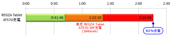 続いて、容量の大きな機器として、東芝のAndroidタブレット「REGZA Tablet AT570」も充電を行った。カタログではバッテリ容量は公表されていないが、3940mAhだという話がある。「REGZA Tablet AT570」に充電を行うと、付属のACアダプタが2A出力であることもあって、「QE-PL201」の1.5A出力がフルに生かされているのか、バッテリの残量表示がどんどん変わっていく。41分46秒後には残量表示がオレンジに、1時間22分10秒後には赤に、2時間15分43秒後には給電が停止した。「QE-PL201」はカタログ値で2ポート給電は2時間30分となっているので、これに近い結果となっている。このとき「REGZA Tablet AT570」は82%まで充電できていた。給電時間は短かったが、その割にはかなり充電できているという印象だ。タブレット端末をここまで充電できれば、予備バッテリとしても安心だろう。また出力が1.5Aと大きいためか、かなり高速に充電できたのもうれしいところだ。