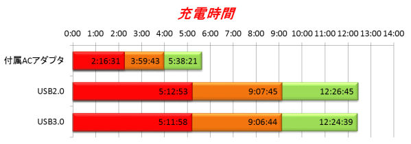 最後に充電時間を見てみよう。「QE-PL201」の残量表示LEDが付かなくなる(付いてもすぐに消え、機器への充電はできない)状態まで放電してからの充電時間である。付属のACアダプタの他に、パソコンのUSB2.0ポートとUSB3.0ポートに接続してテストしてみた。「Qi」対応の充電台は所持していないため、テストできていない。 さて結果を見ると付属のACアダプタでは5時間32分21秒で充電が完了した。カタログには約7時間とあったため、実際よりかなり早く充電できたことになる。続いてUSB接続だが、どちらの場合もほとんど変わらず、USB2.0で12時間26分45秒、USB3.0で12時間24分39秒である。ほぼ誤差と言える範囲だ。カタログには14時間と書かれていたので、これよりは高速だが、付属のACアダプタと比べると倍以上の時間がかかっている事になる。非常に長い時間がかかることがわかる。そして驚きだったのがUSB2.0とUSB3.0で充電時間が変わらないことだ。付属のACアダプタの出力は1000mAである。USB2.0の出力は500mAなので、倍の時間がかかるのも納得と言える。ところがUSB3.0は900mAまで出力できるはずで、実際にこのUSB3.0ポートで消費電流が700mAを超える機器を使用できている。この数値通りなら、付属のACアダプタよりは遅くても、USB2.0よりはかなり短時間で充電できるはずだ。しかし、実際には同じだったことを考えると、入力電流は500mAと1000mAの2種類しか認識せず、1000mA未満の場合はすべて500mAでの充電になっているようだ。最近ではUSB3.0ポートを備えたパソコンも多いため、そこに接続することで少しでも充電時間を短くすると行った事ができないのは残念だ。ちなみに、USB出力付きの電源タップであるバッファロー「BSTA22AUBK」では、USBポートから1000mAの出力が可能であるが、こちらからの充電の場合、付属のACアダプタと変わらない時間で充電できた。 今回はモバイルバッテリを購入したが、1回の充電で、予想以上に様々な機器へ給電が可能であった。これならば旅行などでバッテリが心配な場合でも、それぞれの機器のバッテリの予備を持つよりも便利である。また、充電後の自然放電も少ないように感じたため、常にカバンに入れておけば、急なバッテリ切れにも対応できて便利だ。重量は多少あるが、カバンに入れれば気にならないレベルだし、本体サイズも小さめだ。価格もそれほど高くないため、これまでバッテリ切れで困ったことがあるという人には、ぜひ1台持ってもらいたい製品だ。 (H.Intel) ■今回の関係メーカー・ショップ