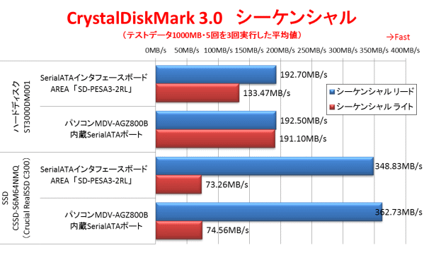 それでは、ベンチマークテストを使用して、「SD-PESA3-2RL」に接続した場合と「MDV-AGZ8000B」のマザーボード上に直接接続した場合で速度を比較してみよう。使用したベンチマークテストは、CrystalDiskMark3.0で、テストデータ1000MB、テスト回数5回としてテストを実行した物をさらに3回行った平均値としている。どちらの場合も、マウスコンピュータの「MDV-AGZ8000B」(CPU:Core i7-3770K(3.50GHz・TuboBoost時3.90GHz・4コア8スレッド)/メモリ:8GB/OS:Windows 7 Premium)に接続しているが、PCI Express x1スロットに挿した「SD-PESA3-2RL」に接続した場合と、マザーボード上のSerialATAポートに直接接続した場合での比較となる。比較検討のために仕様したドライブは、Seagateのハードディスク「ST3000DM001」とCFDのSSD「CSSD-S6M64NMQ」の2台である。Seagateの「ST3000DM001」は3TBのハードディスクで、1TBプラッタで7200回転と現時点で非常に高スペックなハードディスクであり、一般向けとしてはかなり高い性能を示す。ただ、それでも200MB/s前後であるため、より高速なドライブとして、SSDでもテストしている。この「CSSD-S6M64NMQ」はCrucialの「RealSSD C300」という、大人気だったSSDのOEM品で、製品は同じ物だ。SerialATA3.0(6Gbps)に対応しており、読み込み速度は300MB/sを超える。ただ64GBと容量が少ない製品である事から、書き込み速度が遅いため、ハードディスクも同時にテストしているという訳である。