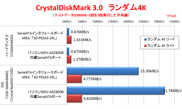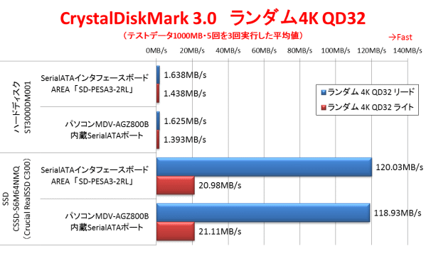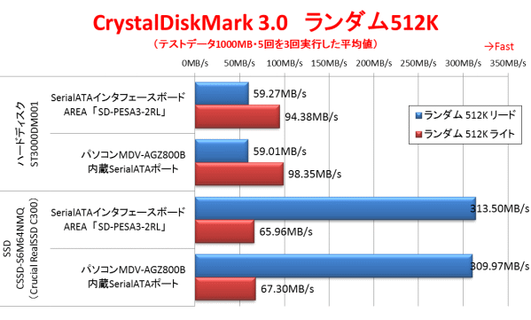 ついでにランダム512Kとランダム4K、ランダム4K QD32の速度でも比較してみよう。ランダム512K、ランダム4K、ランダム4K QD32のいずれのテストでも共に、「SD-PESA3-2RL」に接続した場合とマザーボード上のSerialATAポートに接続した場合で、速度差は見られなかった。ハードディスク「ST3000DM001」ではシーケンシャルライト性能に差があったが、ランダム512Kでは同じ速度になっている。一方。SSD「CSSD-S6M64NMQ」の場合、ランダムリード4Kで速度差があるのは気になるが、原因は不明だ。とはいえ、全体を通して、「SD-PESA3-2RL」は特に遅いと言うことはなかった。