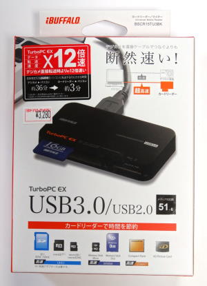ロードテスト第138回でUSB3.0接続が可能で、UHS-I高速転送対応のSDカードと組み合わせる事で超高速な読み書きが可能な、SDカードリーダ/ライター「BSCRSDXU3BK」を購入した。SDカードが非常に高速に読み書きできて重宝していたのだが、ちょっとした不注意から物理的に壊してしまった。そこで、新たに同種の製品を購入することとした。 「BSCRSDXU3BK」はすでに生産が完了していたが、後継機種として「BSCRD04U3」が登場している。見た目は同じであり、SDカードとmicroSDカードにしか対応しないがコンパクトなので、この製品でも良いかと考えていた。しかし、ホームページを見ると、この製品は「9倍速」と書かれている。パソコンとデジカメを直接ケーブルでつないでデータ転送を行う場合を「1倍速」として計算しているようなので、「9倍」という事が具体的に何MB/sの事を示すのかは分からず、あまり意味はないのだが、気になったのは「12倍速」と書かれた「BSCR15TU3」という製品がラインナップされていることだ。何MB/sかは分からないが、「9倍速」より「12倍速」が高速なのは明らかだ。「BSCR15TU3」SDカードだけでなくメモリスティックやコンパクトフラッシュ、xDピクチャーカードまで対応した製品で、本体も大きく価格も高くなる。しかし、SDカードにフルハイビジョンの動画を何時間も撮影する事が多いため、転送時間は結構馬鹿にならない。少しでも高速になるならと思い「BSCR15TU3」を購入することとした。ブラックとホワイトの2色がラインナップされているが、ブラックの「BSCR15TU3BK」を購入した。ヨドバシカメラマルチメディア梅田で2,910円(10%ポイント還元)であった。