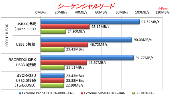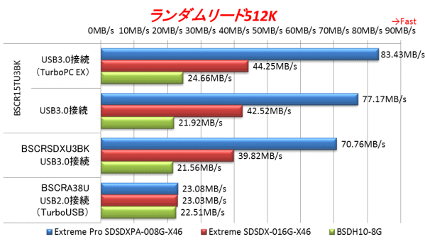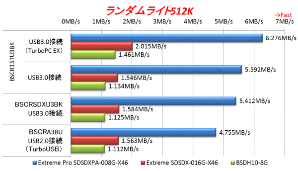 ランダムリードの512Kの結果は、よりおもしろいものとなった。「SDSDXPA-008G-X46」を使用した場合、TurboPC EXを使用しない場合でも「BSCR15TU3BK」は「BSCRSDXU3BK」より6.8%高速で、TurboPC EXを使用すれば17.9%も高速になる。このことから「BSCR15TU3BK」は、単にTurboPC EXというソフトウェアに頼って高速化しているだけではない事と、TurboPC EXはランダムリードのようなデータサイズが小さい方がキャッシュの効果が高いという両面が分かった。確かに、TurboPC EXの説明には、小さなデータをまとめて読み書きすることでロスを削減すると書かれているため、この効果が出たと考えられる。ハード面の高速化と、高速化ソフトウェアにより、かなり速くなっているといえる。このことは、やや低速な「SDSDX-016G-X46」を使用した場合でもはっきりと見て取れる。また、UHS-I高速転送非対応の「BSDH10-8G」ですら、TurboPC EXの効果が分かる結果となった。