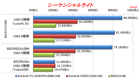 続いて、シーケンシャルライト性能である。こちらは「SDSDXPA-008G-X46」の速度は、TurboPC EXを使用しない「BSCR15TU3BK」でも、「BSCRSDXU3BK」を2.9%上回る速度となっており、さらにTurboPC EXを使用すると12.4%上回る結果となり、「BSCR15TU3BK」の性能の良さが分かる結果となった。またカードの公称値90MB/sに近い値が出ている。当然USB2.0対応の「BSCRA38U」と比べて、圧倒的な差である。やや低速な「SDSDX-016G-X46」では「SDSDXPA-008G-X46」ほどでは無いものの、「BSCR15TU3BK」の速度は非常に高速で、TurboPC EXを使用すると、公称値の45MB/sに近い速度が出せる。「BSCRSDXU3BK」からは4.8%高速になる。一方、シーケンシャルリードと異なり、UHS-I高速転送非対応の「BSDH10-8G」を使った場合でも、「BSCR15TU3BK」の方が高速で、TurboPC EXを使った場合では16.1%、使わなくても9.4%速くなる。「BSCR15TU3BK」はUHS-I対応やUSB3.0対応というだけでなく、全体に高速なチップが使われているなどの違いがあるのかもしれない。