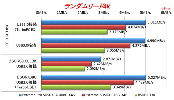 ランダムリード4Kの結果は少々特殊だ。一見すると、「BSCR15TU3BK」は「BSCRSDXU3BK」よりかなり高速になっており、買い換えの効果が見られるようだ。その一方でUSB2.0接続でUHS-I高速転送非対応のメモリカードリーダ「BSCRA38U」と速度の差が見られず、また、TrboPC EXの効果も皆無である。むしろ、理由は不明だが「BSCRSDXU3BK」の速度が、遅かったのが元に戻ったという印象だ。とは言え、「BSCRSDXU3BK」では弱点だったランダムリード4Kの遅さが解消されているのはうれしいことだ。