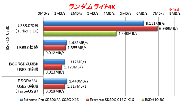 ランダムライト512Kでもランダムリード512Kと似た結果となっている。「SDSDXPA-008G-X46」の結果を見ると、「BSCR15TU3BK」は「BSCRSDXU3BK」より、TruboPX EXを使用しない場合3.3%、使用した場合16.0%高速で、特にTurboPC EXの効果が高い結果となった。メインメモリをキャッシュとして使用することで、小さなサイズのデータが効率よく書き込めているという事だろう。やや低速な「SDSDX-016G-X46」なUHS-I高速転送非対応の「BSDH10-8G」では、メモリカードリーダの違いによる差は見られなかったが、TurboPC EXの効果はランダムリード512Kよりもはっきり現れている。この差は結構大きく、またソフトウェアだけでここまで高速化させているのは驚きである。