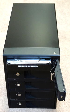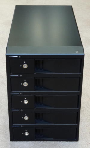 ロードテスト第84回でセンチュリーの「ドライブドアSATAボックス5BAY(EX35ES5)」を紹介した。この製品は、ハードディスクが5台収納可能な外付けハードディスクケースで、1台ずつ外付けハードディスクケースに入れるよりもスペースが小さく見た目もスマートで、電源ケーブルもパソコンとの接続ケーブルも1本ずつで良いなど、非常に便利であった。しかし、最近になって、起動に失敗したり、突然データにアクセスできなくなってしまう事が出てきたのである。ケーブルを替えても症状は変わらず、ハードディスクを取り出して、別の方法でパソコンと接続すると正常に使用できるので、ハードディスクの故障ではない。そもそも5台が一度にアクセスできなくなっているのだから、ハードディスクが一度に壊れたとは考えにくい。パソコン側のeSATAインタフェースボードがおかしいのかとも思ったが、「ドライブドアSATAボックス5BAY(EX35ES5)」を接続できるeSATAポートはポートマルチプライヤに対応している必要があり、我が家には他にポートマルチプライヤに対応したeSATAポートはない。そこでUSB接続をして試してみようかと思ったのだが、すっかり忘れていたのが、なんと「ドライブドアSATAボックス5BAY(EX35ES5)」はeSATA接続専用なのだ。USB2.0で速度が遅くても検証はできるだろうと考えていたのだが、USBポート自体がなかったのだ。 原因ははっきりしないが、「ドライブドアSATAボックス5BAY(EX35ES5)」は2009年8月26日購入なので、丸4年。1日も休むことなく働いていたので、故障してもおかしくない。このあたりでUSB3.0に対応したケースに買い換えることとした。