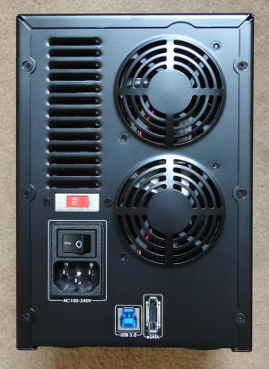 それでは「裸族の集合住宅5Bay USB3.0&eSATA(CRSJ535EU3)」を見てみよう。本体サイズは幅が130mm、高さが185mm、奥行きが260mmである。3.5インチハードディスクのサイズは、製品によりミリ単位の差はあるが、幅が約102mm、高さが約26.1mm、奥行きが約147mmである。5台重ねると、102×130.5×147mmとなる。奥行きは仕方がないとして、幅と高さはハードディスクを5台収納することを考えるとかなりコンパクトだと言えるだろう。前面には5つのドアが並んでいる。「ドライブドアSATAボックス5BAY(EX35ES5)」では、前面全体にメッシュのフロントドアが付いていたが、「裸族の集合住宅5Bay USB3.0&eSATA(CRSJ535EU3)」は各ハードディスクの段が正面から見えている。このドアを開けてハードディスクを挿し込む形となる。1段ずつ独立しており、5段あるのが、いかにも5台のハードディスクを搭載できるのを主張して言る。「ドライブドアSATAボックス5BAY(EX35ES5)」は5段のハードディスクベイの最下段に、電源ボタンと5台それぞれのLEDアクセスランプがまとめて並んでいたが、「裸族の集合住宅5Bay USB3.0&eSATA(CRSJ535EU3)」は5段目のハードディスクベイの下にスペースが無い。一見すると全体がハードディスクベイとなっていて、上から下までドアとなっている感じだ。アクセスランプは、各ドライブベイの左上の隙間に細長く取り付けられている。「ドライブドアSATAボックス5BAY(EX35ES5)」のように、独立した場所に5つが並んでいるのではなく、それぞれにアクセスランプが付いているため、ある意味分かりやすくなったと言える。 正面に電源ボタンが無くなったため、背面に電源スイッチが用意される。頻繁に電源をオン・オフする人には前面に電源ボタンがある方が便利だろうが、私の場合常に電源を入れているため電源ボタンを操作することはほとんどなく問題ないといえ、むしろ正面から見たときにすっきりしていて好印象だ。電源連動機能も搭載しているので、パソコンの電源を切ると「裸族の集合住宅5Bay USB3.0&eSATA(CRSJ535EU3)」の電源も切れるので安心だ。その電源だが、200W電源を内蔵していると言うことなので、高速なハードディスクを5台取り付けても安心だ。背面にはそれ以外に電源コネクタと、USBコネクタ、eSATAコネクタ、冷却ファンが並んでいる。ACアダプタ方式ではなく、「裸族の集合住宅5Bay USB3.0&eSATA(CRSJ535EU3)」に電源が内蔵されているため、電源コネクタはパソコンや液晶ディスプレイのような長方形の角を2カ所斜めに切り取ったような6角形をしたコネクタだ。一般的なコネクタなので、別途長いケーブルを用意することも可能だろう。USBコネクタもeSATAコネクタも一般的な形状で、市販のケーブルが利用できる。USBコネクタは、もちろんUSB3.0形状である。冷却ファンは6cmファンが2つ縦に並んでいる。「ドライブドアSATAボックス5BAY(EX35ES5)」はハードディスク用に8cmファン、電源用に4cmファンが使用されていたが、今回は同じサイズが2つとなっている。2500回転/分という事なので、冷却能力とノイズ量のバランスがとれているように感じる。