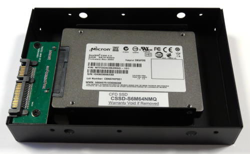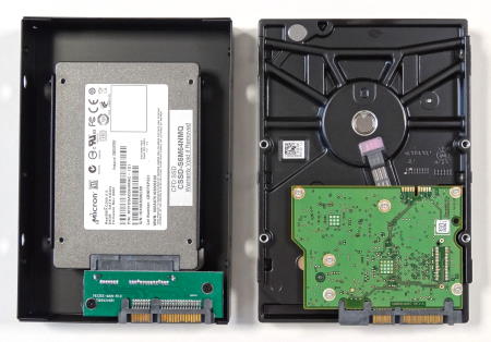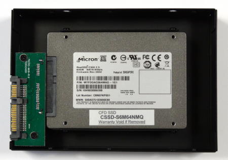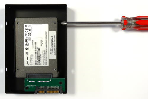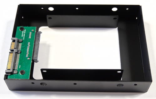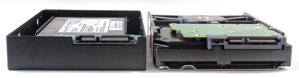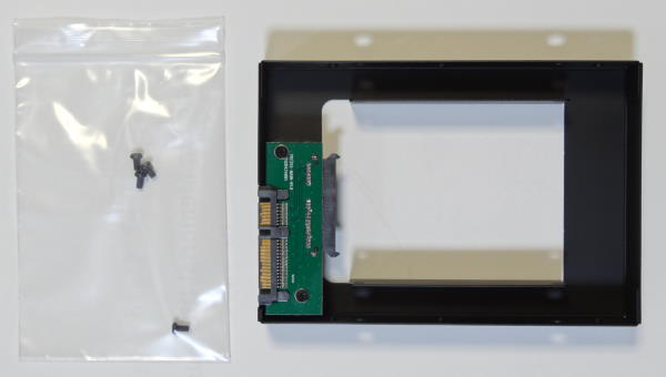 「裸族の集合住宅5Bay USB3.0&eSATA(CRSJ535EU3)」には、おもしろいものが付属している。それが「裸族のインナー」である。これは2.5インチハードディスクやSSDを3.5インチサイズに変換するためのアダプタだ。最近ではデスクトップパソコンにSSDを組み込むことも多く、そのため3.5インチベイに2.5インチハードディスク/SSDを取り付けられるアダプタが多数販売されている。しかし「裸族のインナー」がおもしろいのは、箱形のアダプタの内部に取り付けるようになっており、ネジ穴の位置だけでなく幅や奥行き、厚みまで3.5インチハードディスクと同じサイズになることである。しかも2.5インチハードディスク/SSDのコネクタをそのまま利用するのではなく、内部にSerialATAコネクタがあり、ここに2.5インチハードディスク/SSDを接続する事で、SerialATAコネクタの位置まで完全に3.5インチハードディスクと同じ位置になる。これにより、今回のようにスロットイン方式でハードディスクを取り付けるケースにも、2.5インチハードディスク/SSDが問題なく取り付けられるようになるという製品だ。この「裸族のインナー」は単体でも「CRIN2325」の型番で販売されているが、「裸族の集合住宅5Bay USB3.0&eSATA(CRSJ535EU3)」にも1つ付属するというのはなんともうれしいおまけである。 この「裸族のインナー」は実際には側面の4面と上面の一部が金属パーツで3.5インチハードディスクサイズになっている。表側の2.5インチハードディスク/SSDを取り付ける部分と裏面は完全に開いているため、箱の開けて取り付けるのではなく、裏側から簡単に取り付けられる。裏側から見ると、2.5インチハードディスク/SSDの幅で金属板が立っているため、この間にはめると、ちょうどSerialATAのコネクタに接続できる。あとはネジ止めをして金属板に固定するだけである。ネジ穴の位置は、外側の金属フレームにも穴が開けられているため外側からドライバーでネジ止めか可能だが、ネジを手に持つスペースが小さいため、磁石になっているドライバーの方が作業はしやすいだろう。