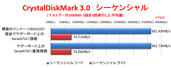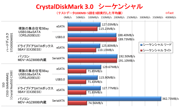 それでは、ベンチマークテストを使用して、「裸族の集合住宅5Bay USB3.0&eSATA(CRSJ535EU3)」の速度をテストしてみよう。「裸族の集合住宅5Bay USB3.0&eSATA(CRSJ535EU3)」はeSATAとUSB3.0の両方でテストを行っている。さらに、これまで使用してきた「ドライブドアSATAボックス5BAY(EX35ES5)と、パソコンに内蔵した場合の速度とも比較してみよう。使用したベンチマークテストは、CrystalDiskMark3.0で、テストデータ1000MB、テスト回数5回としてテストを実行した物をさらに3回行った平均値としている。いずれのテストも、マウスコンピュータの「MDV-AGZ8000B」(CPU:Core i7-3770K(3.50GHz・TuboBoost時3.90GHz・4コア8スレッド)/チップセット:Intel Z77 Express/メモリ:8GB/OS:Windows 7 Premium)に接続している。パソコン内蔵のテストは、マザーボード上のSerialATA 6Gbpsポートに接続してテストを行った。USB3.0接続の場合は「MDV-AGZ8000B」標準搭載のUSB3.0ポートに接続した。eSATA接続の場合は、「MDV-AGZ8000B」のPCI Express x1スロットに増設したバッファロー「IFC-PCIE2ES」に接続している。テストに使用したドライブは、Seagateのハードディスク「ST3000DM001」とCFDのSSD「CSSD-S6M64NMQ」の2台である。Seagateの「ST3000DM001」は3TBのハードディスクで、1TBプラッタで7200回転と現時点で非常に高スペックなハードディスクであり、一般向けとしてはかなり高い性能を示す。ただ、それでも読み書き速度は200MB/s前後であるため、より高速なドライブとして、SSDでもテストしている。この「CSSD-S6M64NMQ」はCrucialの「RealSSD C300」という、大人気だったSSDのOEM品で、製品は同じ物だ。SerialATA3.0(6Gbps)に対応しており、読み込み速度は300MB/sを超える。ただ64GBと容量が少ない製品である事から、書き込み速度が遅いため、ハードディスクも同時にテストしているという訳である。