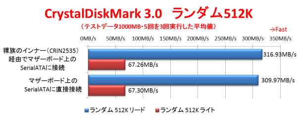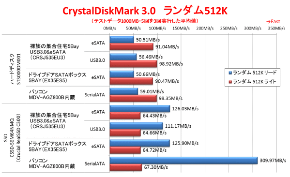 続いて、ランダム512Kのリード/ライト性能である。ランダムアクセスではハードディスクの方は速度が大きく落ちるため、パソコンに内蔵する場合と速度の差がほとんど無くなっている。とは言え、「裸族の集合住宅5Bay USB3.0&eSATA(CRSJ535EU3)」のeSATA接続と「ドライブドアSATAボックス5BAY(EX35ES5)」のeSATA接続はほぼ同等の速度である一方、「裸族の集合住宅5Bay USB3.0&eSATA(CRSJ535EU3)」のUSB3.0接続の方が10%程度高速である。「裸族の集合住宅5Bay USB3.0&eSATA(CRSJ535EU3)」がUSB3.0接続の方が効率が良いのか、チップセットのUSB3.0ポートの方が拡張スロットに挿したカードを経由するより効率が良いのかは不明だ。とはいえ、ランダムアクセスとなると、パソコンに内蔵した場合とほぼ同じ速度が出ているため安心だ。 一方SSDの結果は、シーケンシャルアクセスの時と同じような結果だ。SSDでは512K程度のランダムアクセスでは速度があまり落ちない事もあるが、ランダムアクセスでもUSB3.0接続の速度が遅いのは変わらない。SSDを接続する場合は気になる結果である。