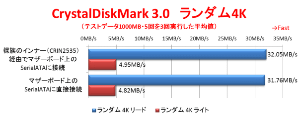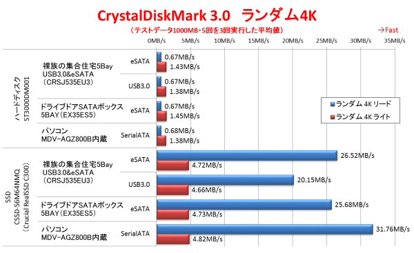 ランダム4Kのリード/ライト性能の結果である。ハードディスクでの結果を見る限りでは速度の差はほぼ無いと言っても良いだろう。ただ、SSDの結果を見ると、ランダム4Kリードに関しては、eSATA接続でもパソコンに内蔵した場合より遅く、USB3.0接続ではさらに速度が落ちるという結果である。やはり何らかの問題があるようだ。ただ、eSATA接続に限って言えば、これまで使っていた「ドライブドアSATAボックス5BAY(EX35ES5)」と同じ速度が出ており、「裸族の集合住宅5Bay USB3.0&eSATA(CRSJ535EU3)」自体の性能は悪くないと言えるだろう。