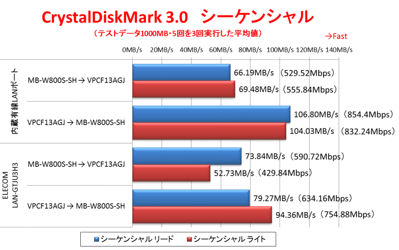 | グラフの「MB-W800S-SH→VPCF13AGJ」は「MB-W800S-SH」上でベンチマークテストを実行し「VPCF13AGJ」上の共有フォルダにアクセスするという事を表している。「VPCF13AGJ→MB-W800S-SH」はその逆である。まずテスト全体を見ると、なぜか「MB-W800S-SH→VPCF13AGJ」