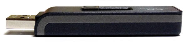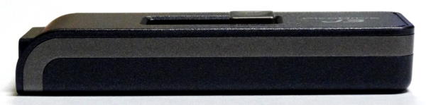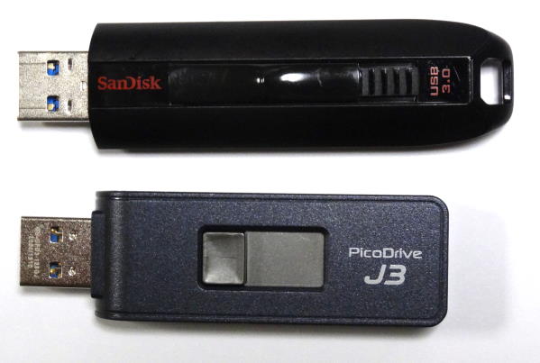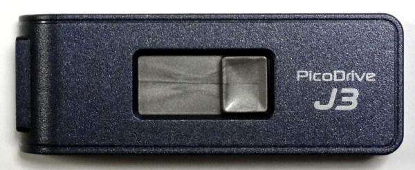 それでは早速PicoDrive J3「GH-UFD3-128GJ」を見ていこう。外見は直線的で凝ったデザインでは無いが、USB端子と反対側は上から見ると角が丸くなるようになっており、逆に端子側は側面から見て上から下に丸くなるようなデザインとなっている。USB端子はスライド式で収納されており、前面のスライドスイッチをスライドさせてUSB端子を出すことになる。キャップ式と比べてキャップをなくす心配も無く、また片手で端子を出せるので便利だ。この辺りはSanDiskExtreme「SDCZ80-016-X46」と同じである。しかし、スライドスイッチのスムーズさが全く違う。SanDiskExtreme「SDCZ80-016-X46」では、軽い力でスライドし、しかもスライドさせていくと、USB端子が完全に飛び出る直前になるとバネの力でピョンと勢いよく飛び出すし、逆に収納される直前も、勢いよく収納されるこの感覚が心地よい。それに対してPicoDrive J3「GH-UFD3-128GJ」のスライドスイッチは、ギシギシという感じで、スムーズさが無い。言い換えればSanDiskExtreme「SDCZ80-016-X46」はコロが付いていて、PicoDrive J3「GH-UFD3-128GJ」は付いていないような、そんな違いがある(実際には付いていないのだが、それくらいの差があるという事)。スライドスイッチを少し押し込んでスライドさせるのだが、この押し込むのもはっきりせず、スライドスイッチがたわんだだけにも感じるが、何となく押し込んでスライドさせていく事になる。この辺りはチープに感じるが、実際に安価なだけに仕方のないところだろう。出てきたUSB端子は中が青く塗られているのがUSB3.0対応を主張しているようだ。USB端子はスライドこそ少しスムーズさに欠けるが、出してみるとしっかりしており、ぐらつくこともなく、USB端子に挿すときに押し込まれてしまうようなこともない。 大きさは、59.5×21.6×10.0mmで、流行の超小型USBメモリと比べると大きいが、一般的なサイズのUSBメモリと比べて特に大きいわけではない。SanDiskExtreme「SDCZ80-016-X46」も71×21×11mmなので、やや長さが短いと言った感じだ。128GBもの大容量メモリを搭載していながら、本体が小型のままなのはうれしい所だ。