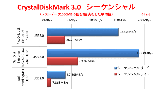 それでは、肝心の転送速度ををベンチマークテストを利用して比較してみよう。今回購入したUSBメモリPicoDrive J3「GH-UFD3-128GJ」の他に、少し前に購入した高速USBメモリであるサンディスクのSanDiskExtreme「SDCZ80-016-X46」、さらにかなり前に購入したUSB2.0対応のpqiの「TravellingDisk U230」でも比較としてテストを行った。 使用したベンチマークテストは、CrystalDiskMark3.0で、テストデータ1000MB、テスト回数5回としてテストを実行した物をさらに3回行った平均値としている。いずれのテストも、マウスコンピュータの「MDV-AGZ8000B」(CPU:Core i7-3770K(3.50GHz・TuboBoost時3.90GHz・4コア8スレッド)/チップセット:Intel Z77 Express/メモリ:8GB/OS:Windows 7 Premium)標準搭載のUSB3.0ポートに接続して行っている。
