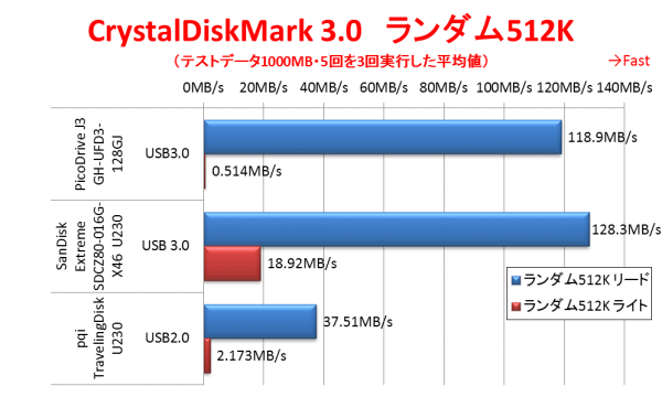 続いてランダムアクセス性能である。まずは512Kの比較的大きなサイズのランダムアクセスである。。PicoDrive J3「GH-UFD3-128GJ」は読み込みが118.9MB/sとなっており、シーケンシャルリードとからの速度低下が19.0%と小さい。SanDiskExtreme「SDCZ80-016-X46」では32.1%落ちたのと比べると小さく、結果、SanDiskExtreme「SDCZ80-016-X46」に近い性能を示している。非常に高速だと言えるだろう。一方、書き込み速度は読み込み速度と正反対で落ち幅が大きい。わずか0.514MB/sしかなく、シーケンシャルライトの70分の1になっている。SanDiskExtreme「SDCZ80-016-X46」とは比べるまでもなく、「TravellingDisk U230」よりも遅くなってしまっている。ここまで急激に遅くなる原因は不明だが、低価格で大容量にするためにメモリにTLCを使用していると思われ、これが原因とも考えられる。SanDiskExtreme「SDCZ80-016-X46」は速度重視でMLCを、「TravellingDisk U230」は古い製品なので、まだTLCがなくMLCを採用しているのではと推測され、この辺りで差が出た可能性はある。何はともあれ、PicoDrive J3「GH-UFD3-128GJ」は大きなファイルを書き込む場合はそれなりに速いが、小さなファイルを書き込む場合は注意が必要だと言えるだろう。
