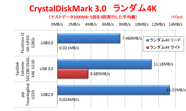 続いて比較的小さな4Kのランダムアクセス性能である。PicoDrive J3「GH-UFD3-128GJ」の読み込み速度は7.46MB/sで、3製品中最下位だが、これは「TravellingDisk U230」がなぜか非常に高速なためで、同じUSB3.0のSanDiskExtreme「SDCZ80-016-X46」に大きく離されているわけではない。十分な速度と言えるだろう。一方書き込み速度はは相変わらず非常に遅く、SanDiskExtreme「SDCZ80-016-X46」と比べて175分の1の速度しか出ていない。一方で「TravellingDisk U230」とはほぼ同じ速度になっており、ランダム512Kの時よりはマシだとも言える。いずれにしても小さなファイルを書き込む速度は期待しない方が良さそうだ。 今回は容量不足を補う方法としてUSBメモリを使用してみた。PicoDrive J3「GH-UFD3-128GJ」はスライドスイッチの作りや、アクセスランプがない点に安っぽさを感じ、またランダムライトが遅いという弱点はある。一方で読み込み速度やシーケンシャルライトの速度は十分に高速で、家で時間のあるときに書き込んでおいて、持ち出して外で見るというような使い方なら問題にならない、むしろ非常に快適に使えるはずだ。また、128GBと大容量ながら、本体サイズが小さく、価格も9000円を切るという点を考えれば、コストパフォーマンスは非常に良い事がわかる。用途にも寄るだろうが、安くて大容量のUSBメモリを探している人にはお勧めできる一品だ。 (H.Intel) ■今回の関係メーカー・ショップ