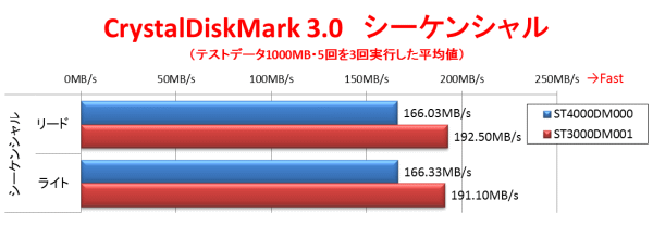 それでは、肝心の転送速度をベンチマークテストを利用して比較してみよう。今回購入した「ST4000DM000」の他に、同メーカーの3TB版「ST3000DM001」でも比較としてテストを行った。 前述のように、こちらは回転数が7200rpmで、回転数の違いがどの程度の差になるのか分かるはずだ。使用したベンチマークテストは、CrystalDiskMark3.0で、テストデータ1000MB、テスト回数5回としてテストを実行した物をさらに3回行った平均値としている。いずれのテストも、マウスコンピュータの「MDV-AGZ8000B」(CPU:Core i7-3770K(3.50GHz・TuboBoost時3.90GHz・4コア8スレッド)/チップセット:Intel Z77 Express/メモリ:8GB/OS:Windows 7 Premium)のマザーボード上のSerial ATA 6Gbpsポートに接続してテストを行っている。