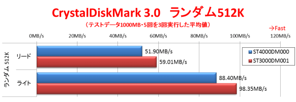 続いてランダムアクセス性能である。まずは512Kの比較的大きなサイズのランダムアクセスである。「ST4000DM000」はリードが51.90MB/s、ライトが88.40MB/sであり、やはり「ST3000DM001」よりは劣るが、それぞれ86.8%と89.9%とシーケンシャルアクセスよりも差は縮まっている。