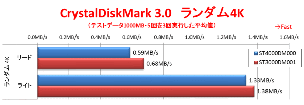 まずはシーケンシャルアクセス性能を見てみよう。ST3000DM001に対してリードで86.2%、ライトで87.0%との性能となっている。回転数が低く、プラッタ容量などが同じなのだから仕方のないところだろう。ちなみに回転数は7200rpmと5900rpmで81.9%であり、回転数の割には検討していると言える。また160MB/sオーバーと言えば一昔前の7200rpmのドライブ並みであり十分に高速であると言える。