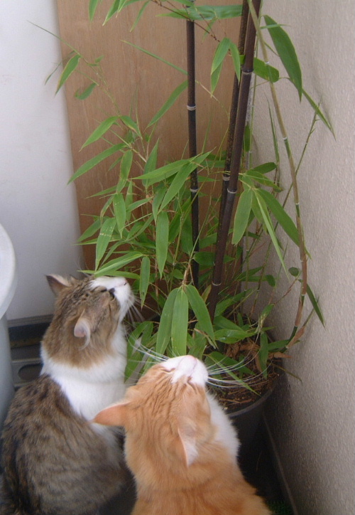 ある日ベランダでのお遊びに網戸を開けてあげると、なんと一目さん(?)に竹に向かうんです。そしてひたすら竹の葉っぱを「カミカミ」するんです。そしてちょっと興奮気味??? マリン&ロビンともに互いに負けじとカミカミ・・・・