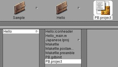 Sampleディレクトリ下にHelloというディレクトリができ、幾つかのファイルが作られます。そのひとつに、PB.projectというファイルがあります。PB.projectは、プロジェクトを管理するファイルで、次回以降は、このPB.projectをダブルクリックするか、ProjectBuilder.appのオープンでオープンして、メンテナンスします。