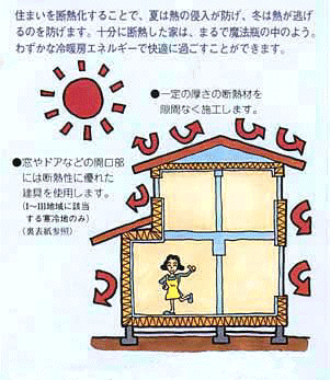 | 住まいを断熱化することで、夏は熱の侵入が防げ、冬は熱が逃げるのを防げます。十分に断熱した家は、まるで魔法瓶の中のよう。わずかな冷暖房エネルギーで快適に過ごすことができます。 |