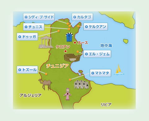 「チュニジアに行く」と言うと、よく、「どこにあるの?」とか、「何があるの?」とか聞かれた。私自身も、長い間行きたいと思っていたものの、あまり予備知識が無いまま訪れたが、行ってみれば、古代の遺跡あり、砂漠あり、白と青の美しい町あり、延々と続くオリーブ畑やナツメヤシの林もあり、たくさんの猫や、時折見かける羊、ラクダなどに癒される素敵な国だった。お天気にも恵まれ、抜けるような濃い青空がとても美しかった。