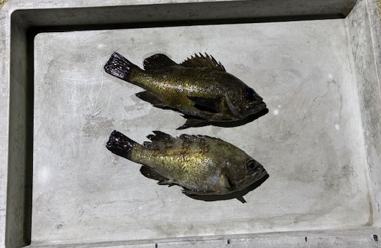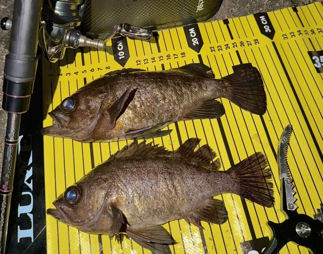 | 半夜便の釣果 萩さん ルアー釣り メバル 〜29cm 2匹 ガシラ 〜約25cm 今日はお連れ様の西さんとご一緒に初ケーソン!! 良型のメバルとガシラが釣れました(^O^)/ 他の方もシーバス3匹GETされていましたよ(^^)v 本日は半夜便にご乗船いただきありがとうございました(*^^*) |
