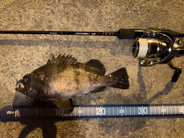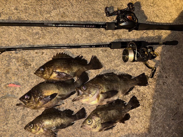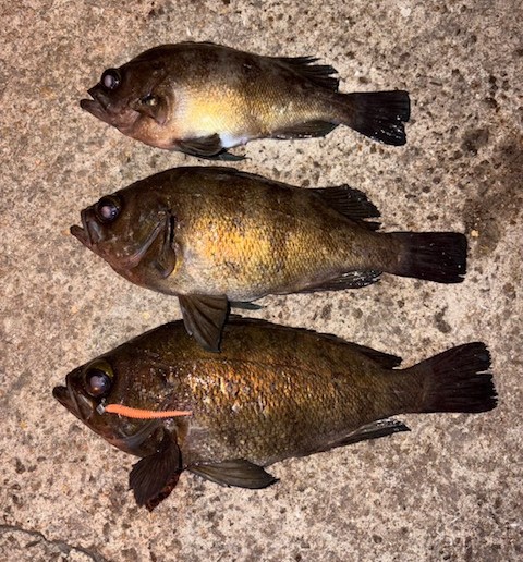 | 森川さん・平松さん 通しの釣果 アジ 〜25cm 100匹以上 シーバス 50cm 1匹 ガシラ 〜20cm 20匹以上 アコウ 35cm 1匹釣れました お久しぶりのケーソン!! アコウはラスト1投で釣れたそうです(*''▽'') アジもよく釣れてますね!(^^)! |