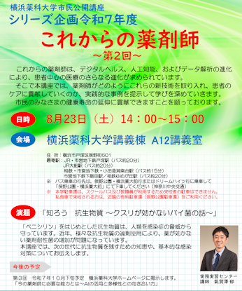 横浜薬科大学で開かれた「市民公開講座・これからの薬剤師「知ろう 抗生物質~クスリが効かないバイ菌の話~」を聴講しました。 主な内容は、①感染症と病原体、②抗生物質と薬剤耐性菌、③耐性菌を増やさないためにできることで、 まとめとして日常心がける事などを説明させました。 ―以上―