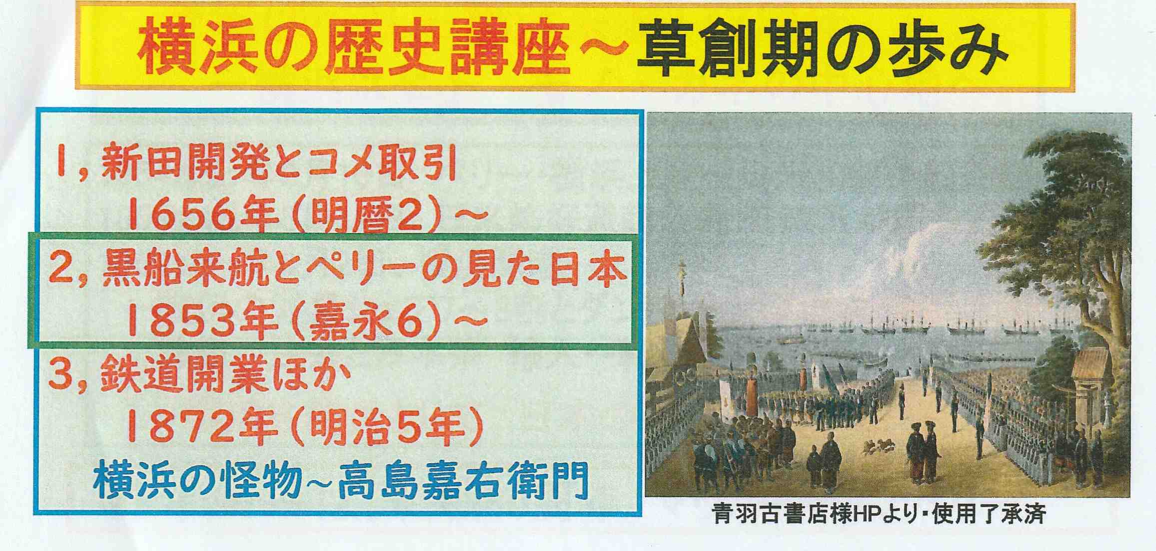 東戸塚地区センター主催の「横浜の歴史~草創期のあゆみ」の第二回を受講しました。 当日は、昼から雪模様になりました。 黒船来航の経緯のほかに、特にペリーからみた日本人の対応・様子(ペリーの日本遠征記など) について詳しく説明され、改めて当時の様子を感じることができました。 残されたいろいろな絵画をもとに説明がありました。特に日米の饗応の話が 興味深いものを感じました。 ―以上―