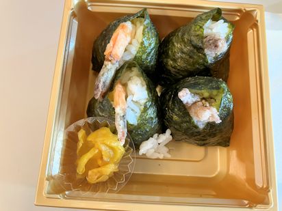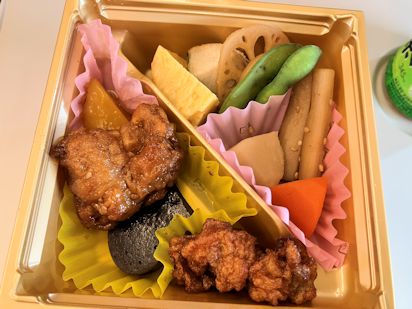 車中は混んでいて、三列席の真ん中B席でしたので、車外の様子も写すことも出来ませんでした。 岡山駅で購入した弁当(おむすびころりん)を食べました。