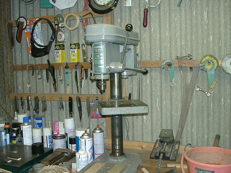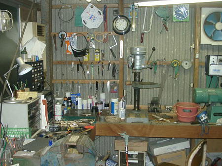本邦初公開 !!! っていうほどの事はないんですが。。。。 私の仕事場兼隠れ家です。男にはこういう場所が必要なんですよね・・・・・。家の横にあった倉庫を間仕切りして基礎工事をし(約1トンの重さに耐えられるよう)床には釘を打っても刺さらないような固い素材の合板材を使用。広さは約6畳ぐらいでしょうか。 ここにL字型に作業台をつけました。 そのさい、台の奥には高さ5センチほどの板を張り、ピンや小物が向こうに落ちないよう工夫しました。 あと、コンセントを多く取り付けました。こうしておくと機械や電気製品を移動させずに利用出来ます。