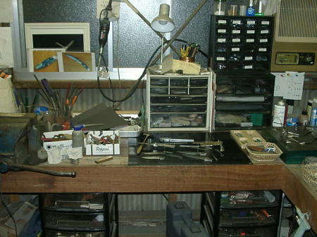 このスペースが工房の中心になります。、ここで組み立て、パーツの研磨、新作の構想を練ります。(時々居眠りもしますが・・・・^^;) 作りかけのナイフのパーツがころがっています。