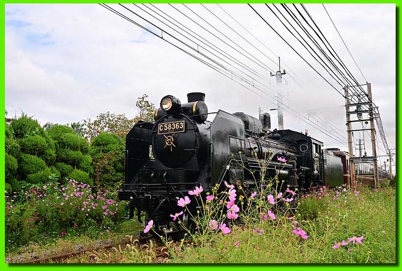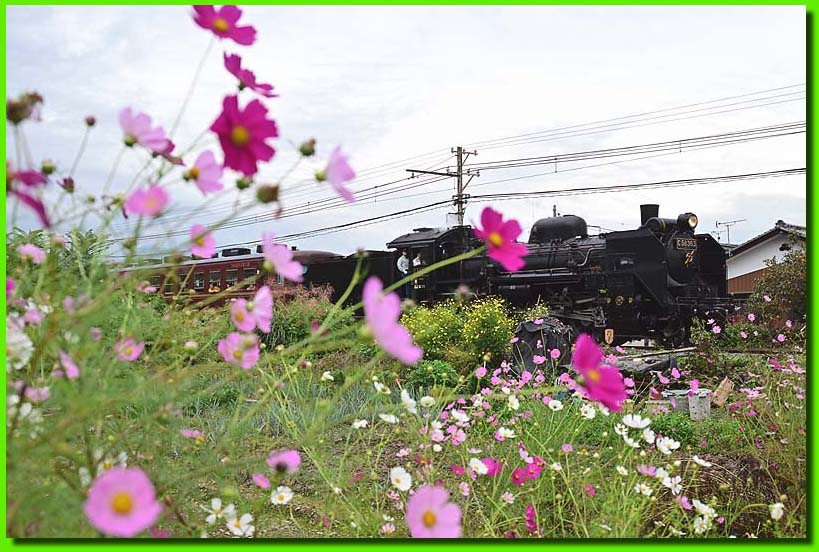 線路端に咲くコスモスに見守られ。