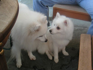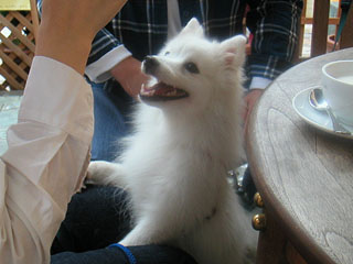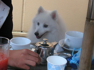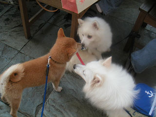 | パパやママ達がお茶している間に、 テーブルの下でもワン同士の交流が・・・ 康太くんとAngieくん、初対面ですね〜 |