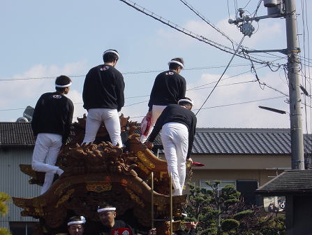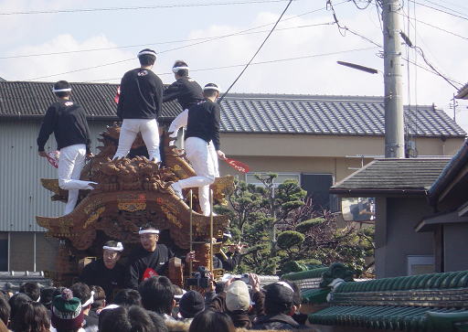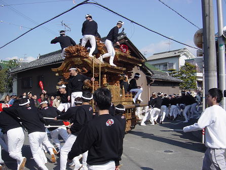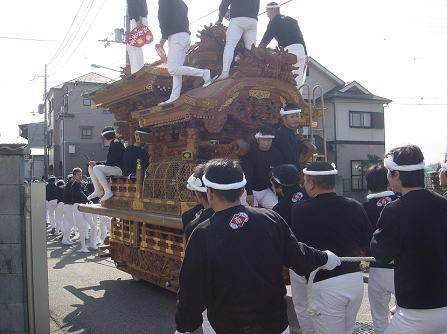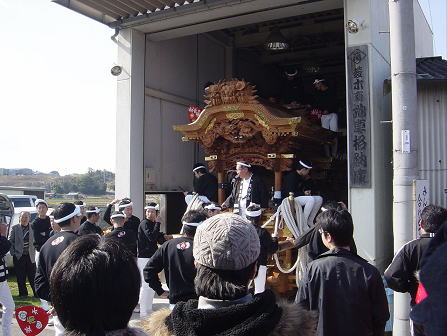 10時47分、菱木神社前に到着。するとコマ跡が!!!遅かったと思いきや、少し進むと、ちょうど「奥」の地車が搬出される所でした。